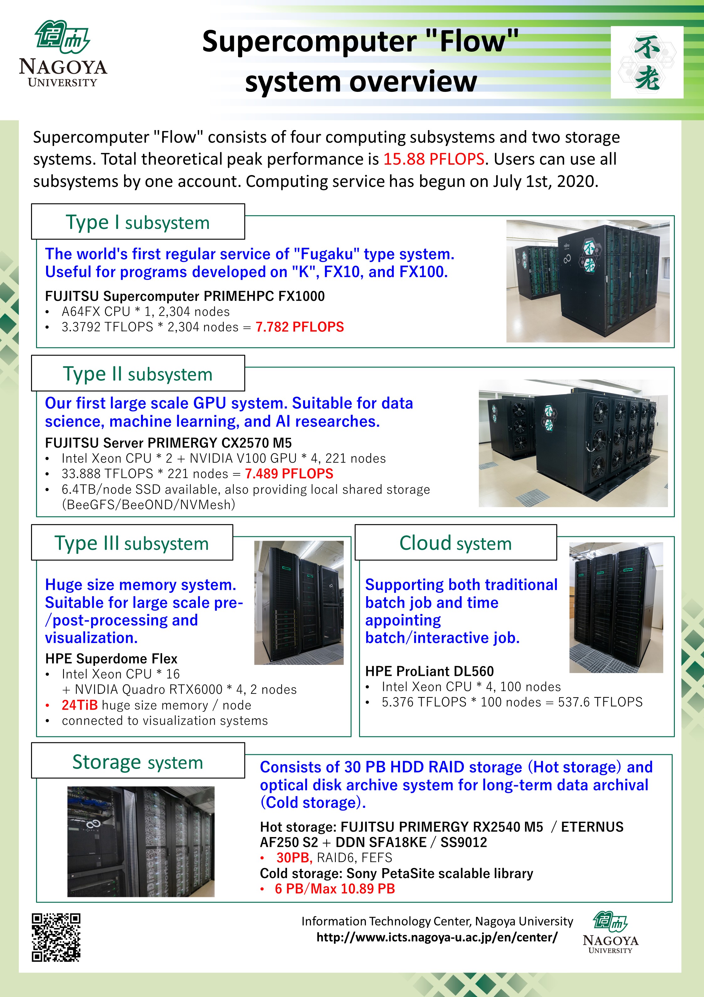 The Information Technology Center, as part of the Information & Communications, Nagoya University, cooperates with the Information Strategy Office, Information Security Office and the Information Promotion Department in order to take responsibility for the development and stable operation of the information infrastructure. including supercomputers and networks for education and research at Nagoya University. The Information Technology Center also plays a role in the research and development of High Performance Computing technology in Japan as part of the Joint Use/Research Center for Interdisciplinary Large-Scale Information Infrastructures which consists of eight facilities, including the Information Technology Centers of seven largest national universities in Japan and the Tokyo Institute of Technology Global Scientific Information and Computing Center. They were originally National Joint-Use Facilities, became Joint Use/Research Centers during the last fiscal year and they provide not only support for users, but also engage in joint national research in cooperation with the Information Technology Centers of the eight universities.