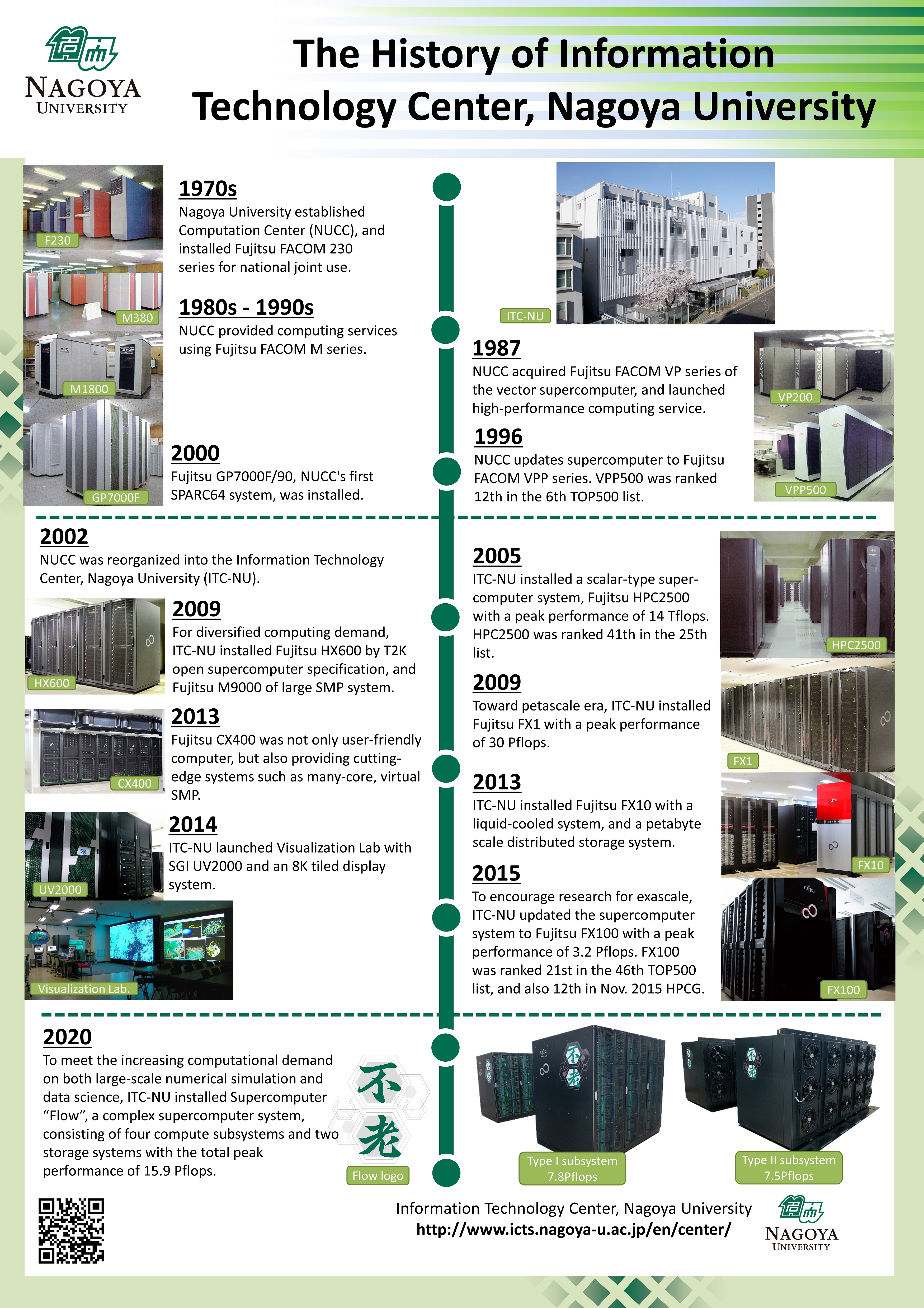 The Information Technology Center, as part of the Information & Communications, Nagoya University, cooperates with the Information Strategy Office, Information Security Office and the Information Promotion Department in order to take responsibility for the development and stable operation of the information infrastructure. including supercomputers and networks for education and research at Nagoya University. The Information Technology Center also plays a role in the research and development of High Performance Computing technology in Japan as part of the Joint Use/Research Center for Interdisciplinary Large-Scale Information Infrastructures which consists of eight facilities, including the Information Technology Centers of seven largest national universities in Japan and the Tokyo Institute of Technology Global Scientific Information and Computing Center. They were originally National Joint-Use Facilities, became Joint Use/Research Centers during the last fiscal year and they provide not only support for users, but also engage in joint national research in cooperation with the Information Technology Centers of the eight universities.
