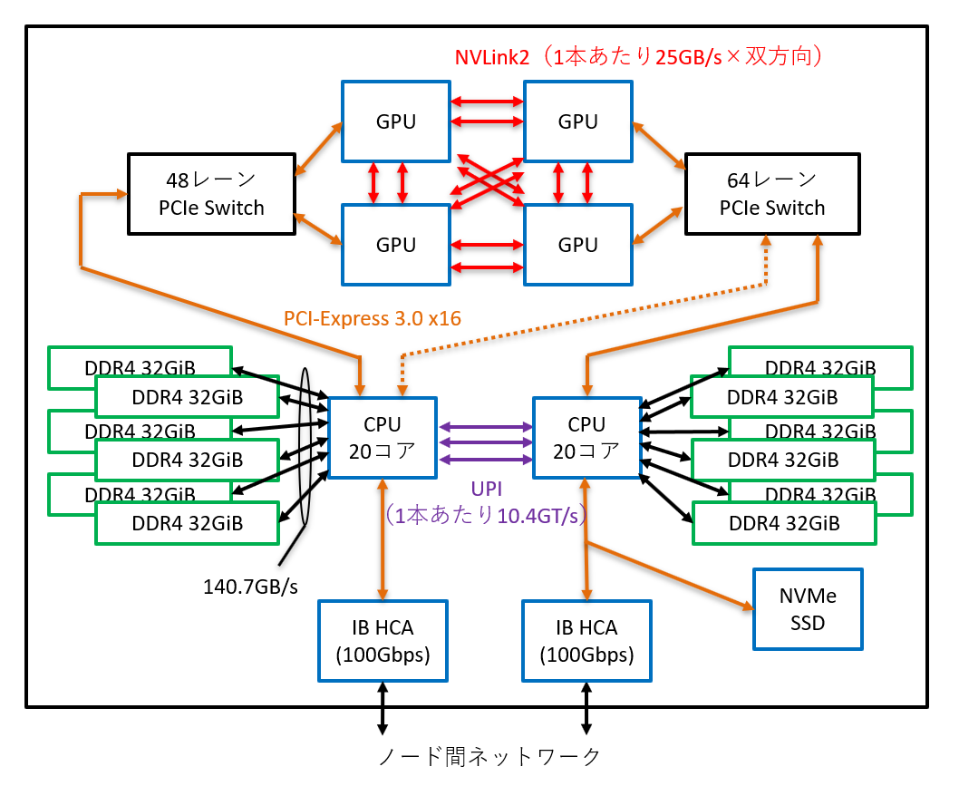 | ノード間インターコネクト | InfiniBand EDR 100 Gbps × 2, 200 Gbps | |