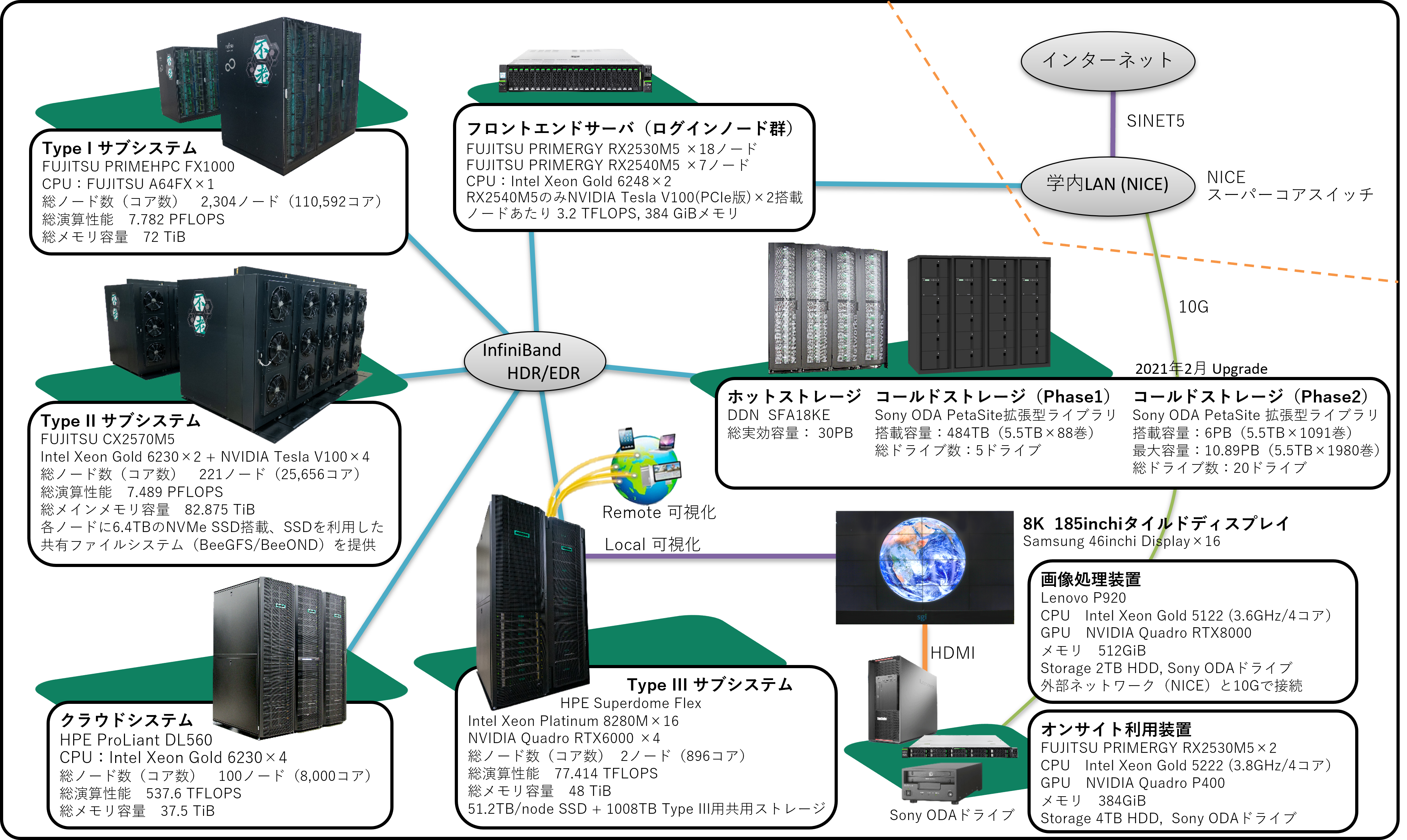 | 計算ノード間インターコネクト | InfiniBand HDR/EDR (Type I内部はTofuインターコネクトD, 他サブシステム内部はEDR, サブシステム間はHDR) |