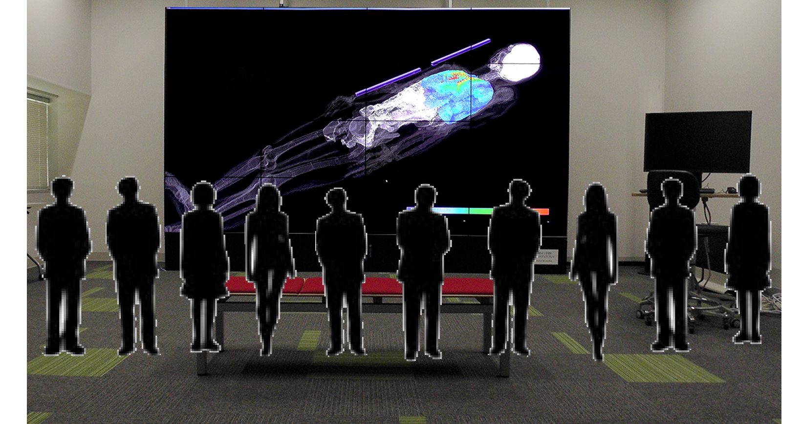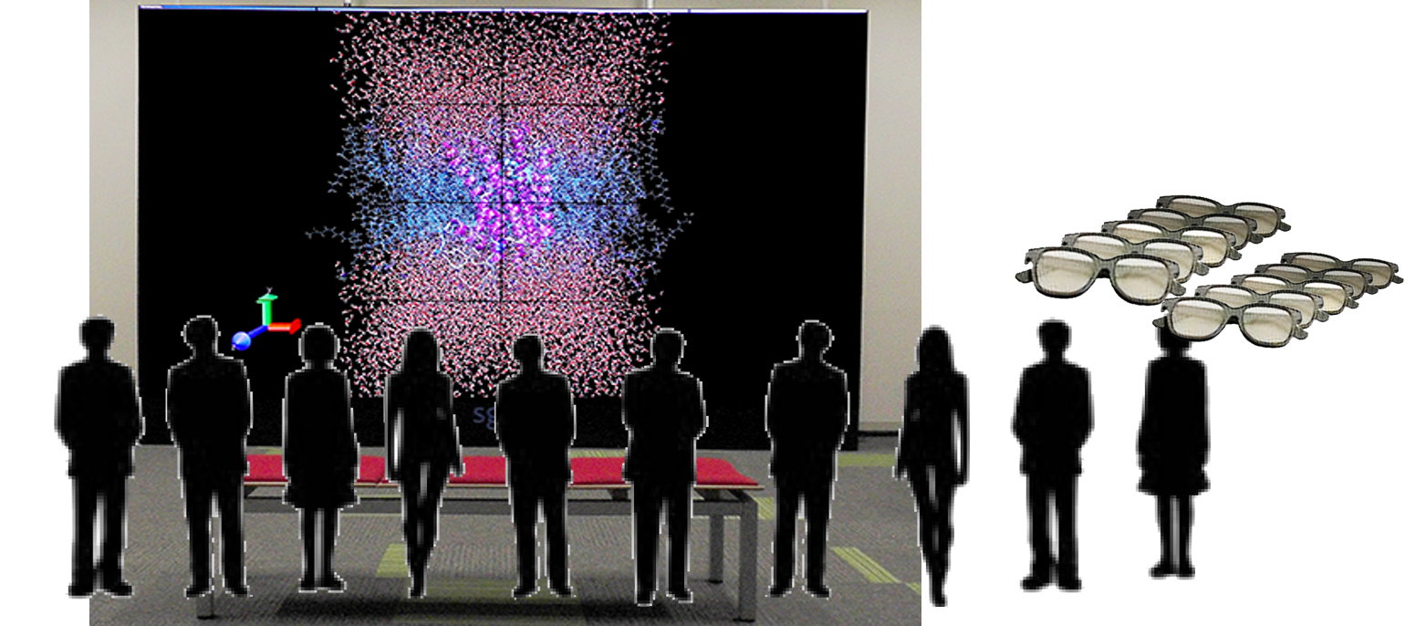 2台のプロジェクタを用いて投影した映像(解像度1920×1080, フルHD)を円偏光メガネで見るタイプの立体システムが利用できます。 多人数で同時に閲覧することができます。 スクリーンの大きさは180インチです。