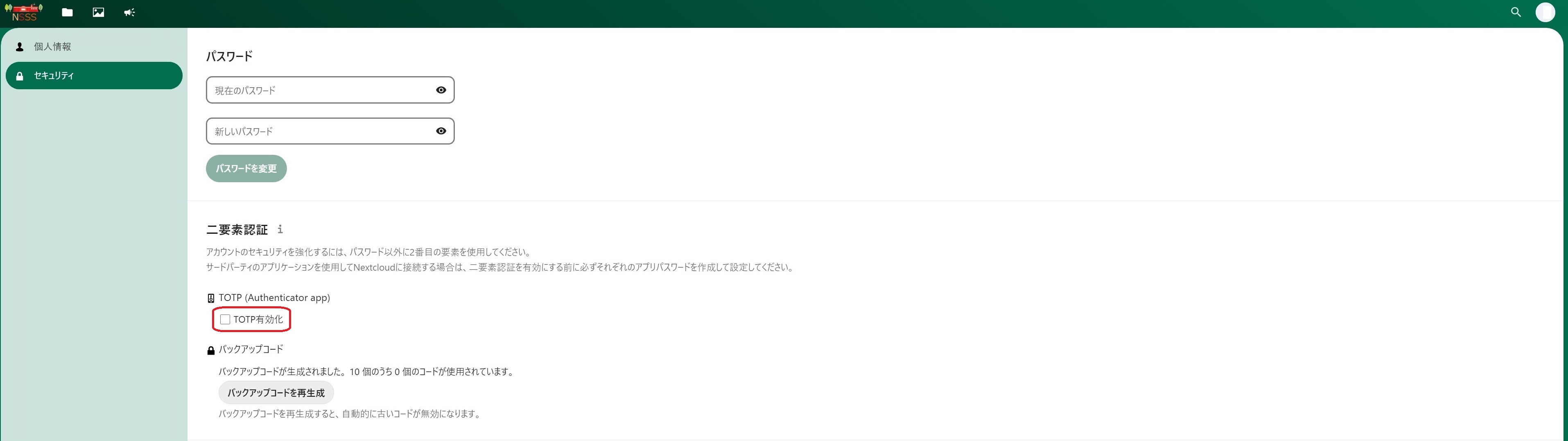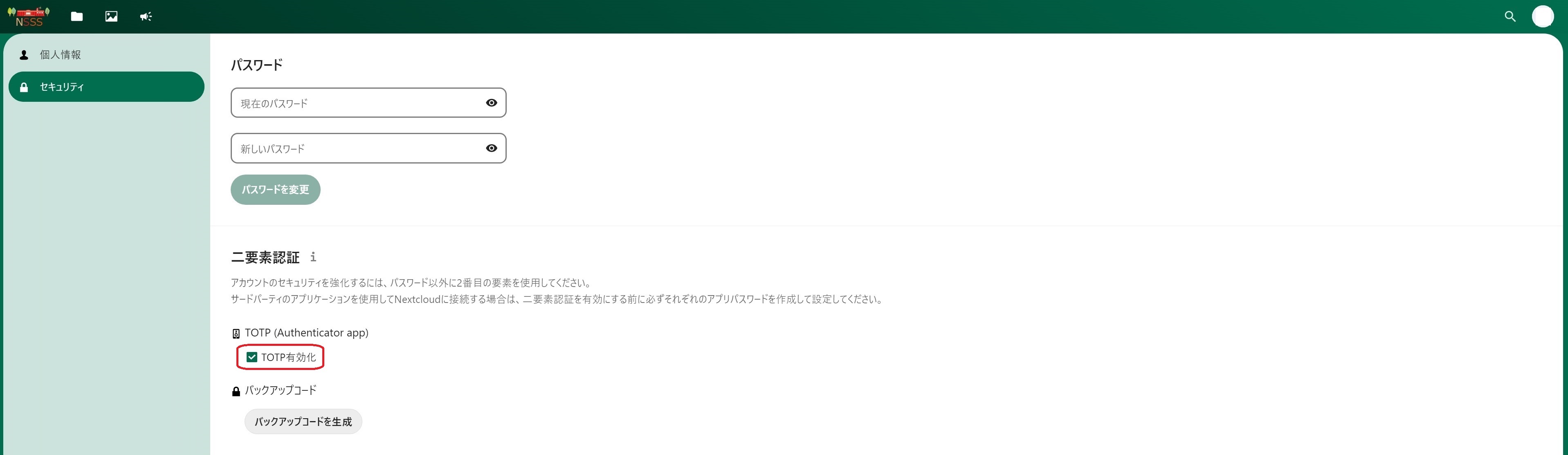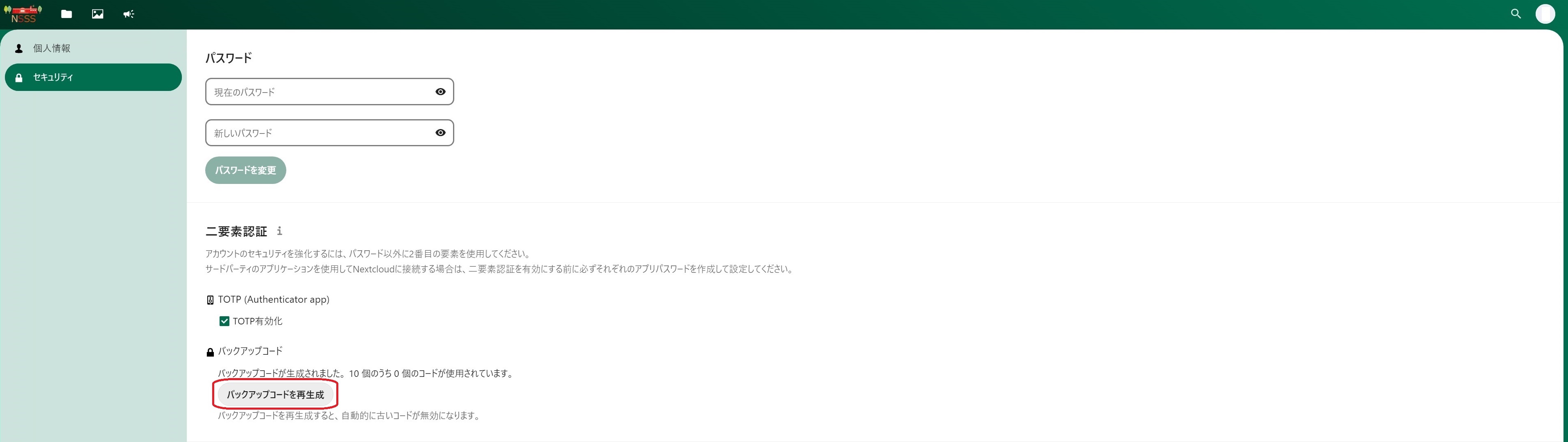 NSSSにログインします。画面右上のアイコン→設定→セキュリティの画面で「バックアップコードを生成」をクリックします。