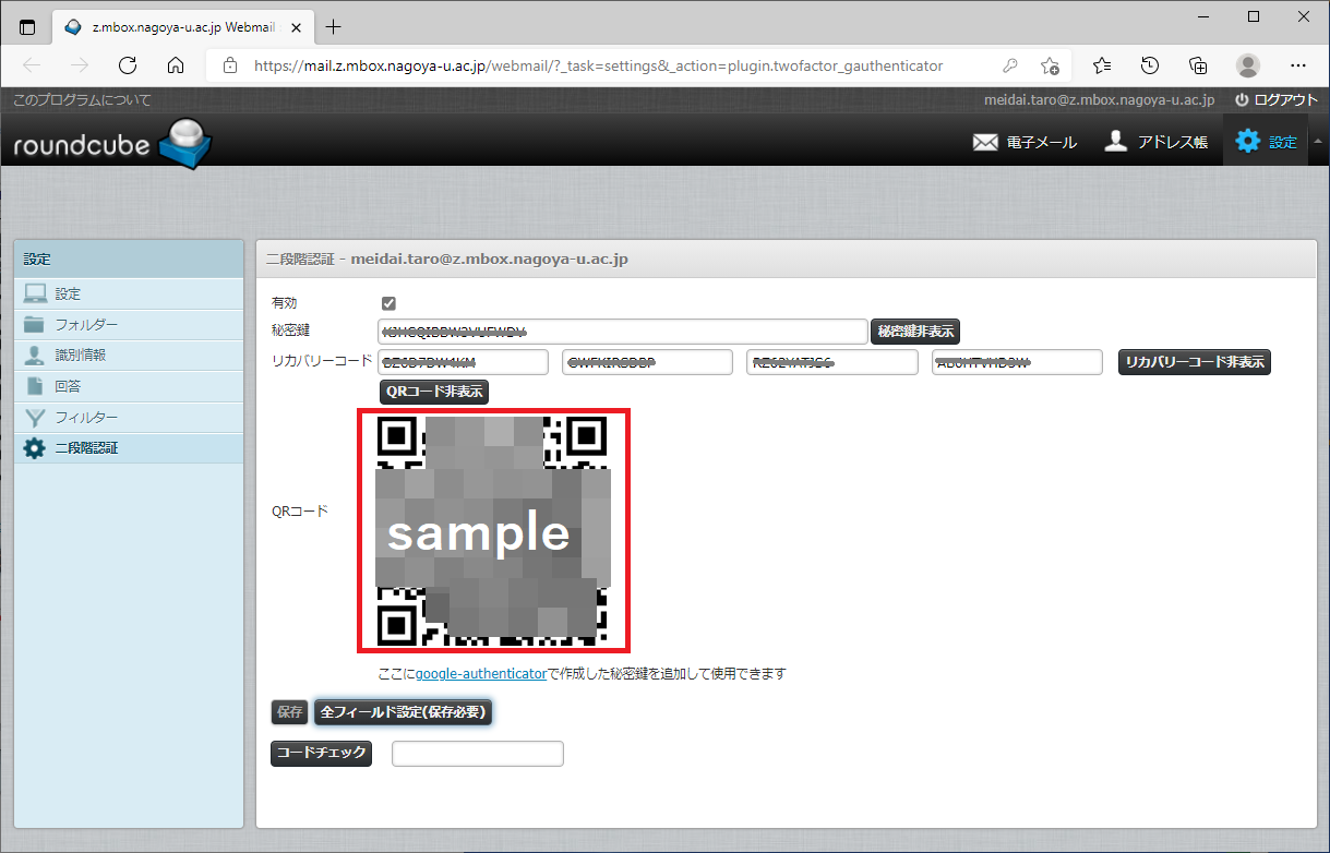 - 「秘密鍵」の欄にroundcubeに表示されている秘密鍵の文字列を入力して下さい。