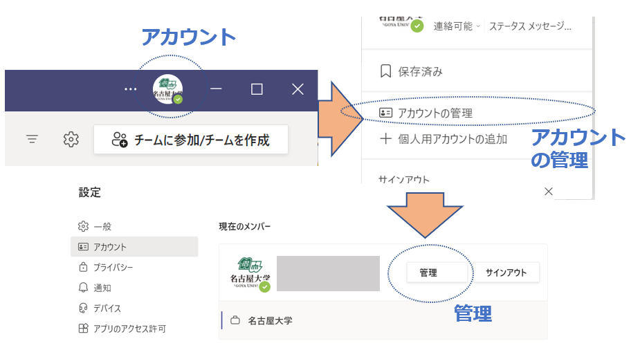 機構Teamsをアプリで利用するために、既存のTeams アプリ上で機構アカウントを設定します。アカウント管理を開き、新しいアカウントでサインインします。