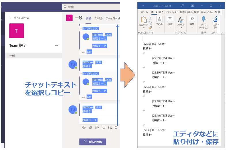 名大Teamsのチームにおける,チャネルのチャット画面上で,マウスカーソルを操作し,残したいチャットテキストを指定・コピーし、テキストエディタなどにペーストしてセーブします。キャプチャできるものは、表示されている画面上のもののみです。必要に応じて発言を展開した上でキャプチャしてください。