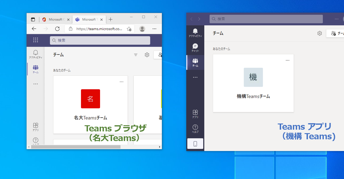 名大Teamsと機構Teamsを併用するために、一方をアプリで、もう一方をWebブラウザで利用するという方法があります。例えば、名大TeamsをWebブラウザで、機構Teamsをアプリとする場合、以下のように併用できます。
